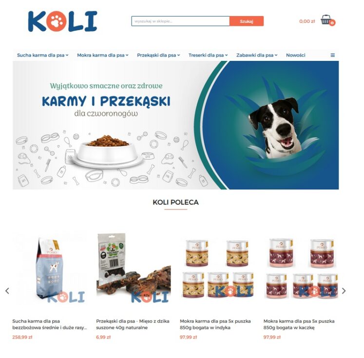 KOLI to sklep online, proponujący zdrowe karmy oraz przekąski dla psów. Asortyment w takim sklepie jest faktycznie obszerny, wobec czego kupujący mają dużo do wyboru. Mogą dopasować wyroby jakimi są treserki dla psa na równi pod kątem rasy, wagi, jak i kondycji zdrowotnej swojego czworonoga. Oferta zawiera produkty podzielone w kategoriach jakimi są: sucha karma dla psa, mokra karma dla psa, przekąski dla psa, treserki dla psa, jak i zabawki dla psa. W osobnej kategorii umieszczono bestsellery i nowości.